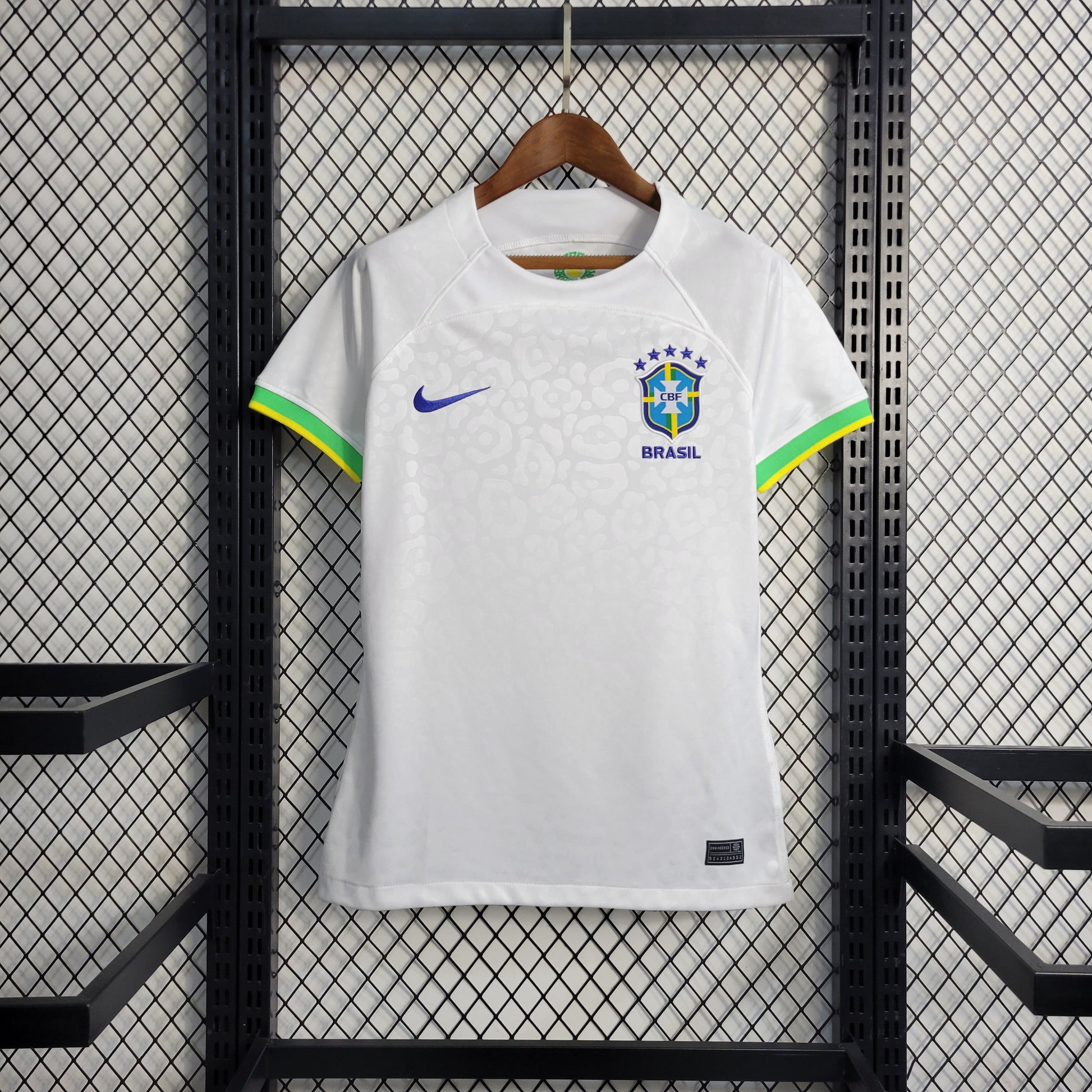 The official Brazil Women's White Jersey offers a fresh and modern take on national team apparel. Perfect for fans who appreciate a minimalist aesthetic, this jersey combines a crisp white base with iconic green and yellow accents, all in a fit designed specifically for women.