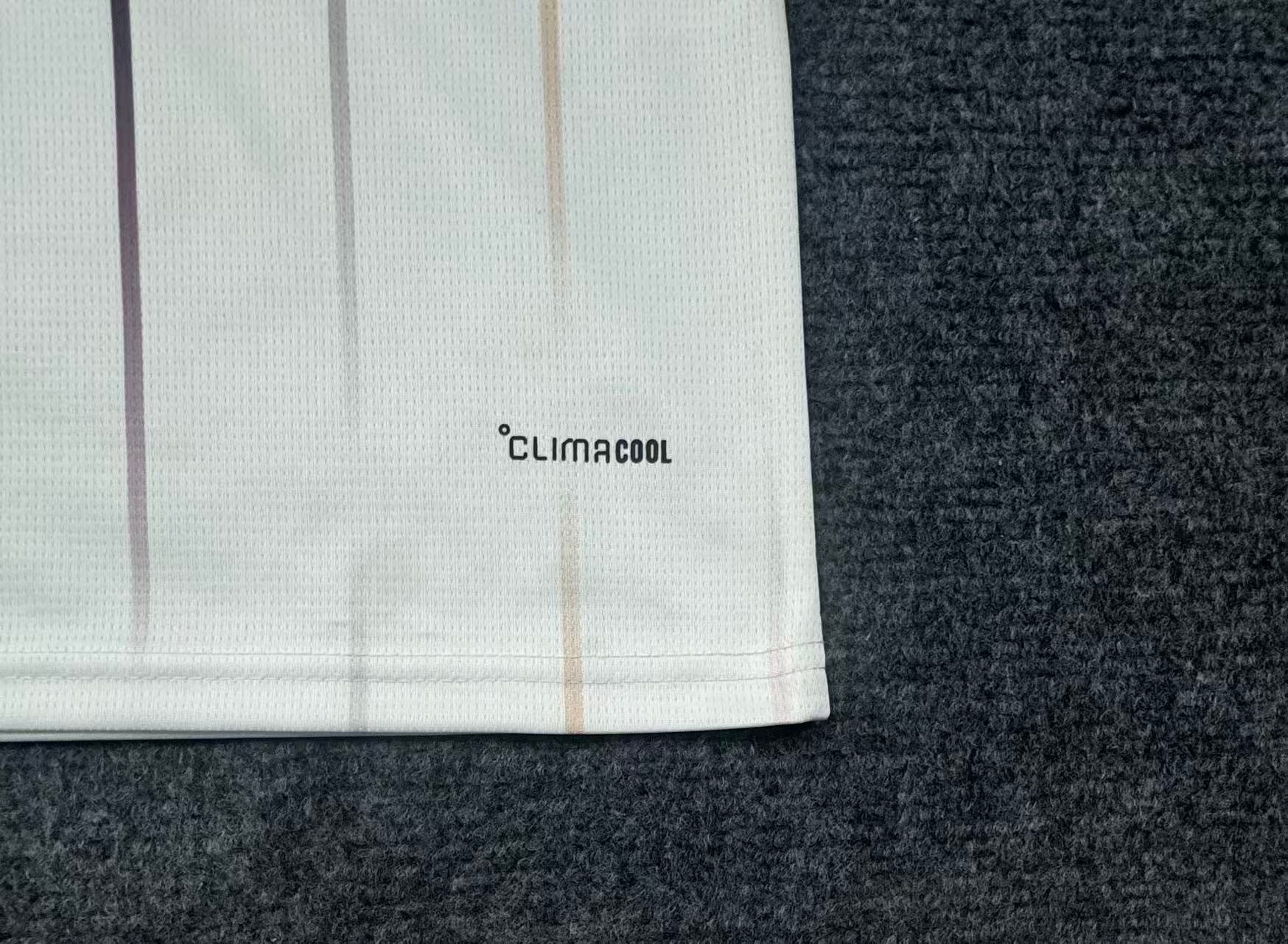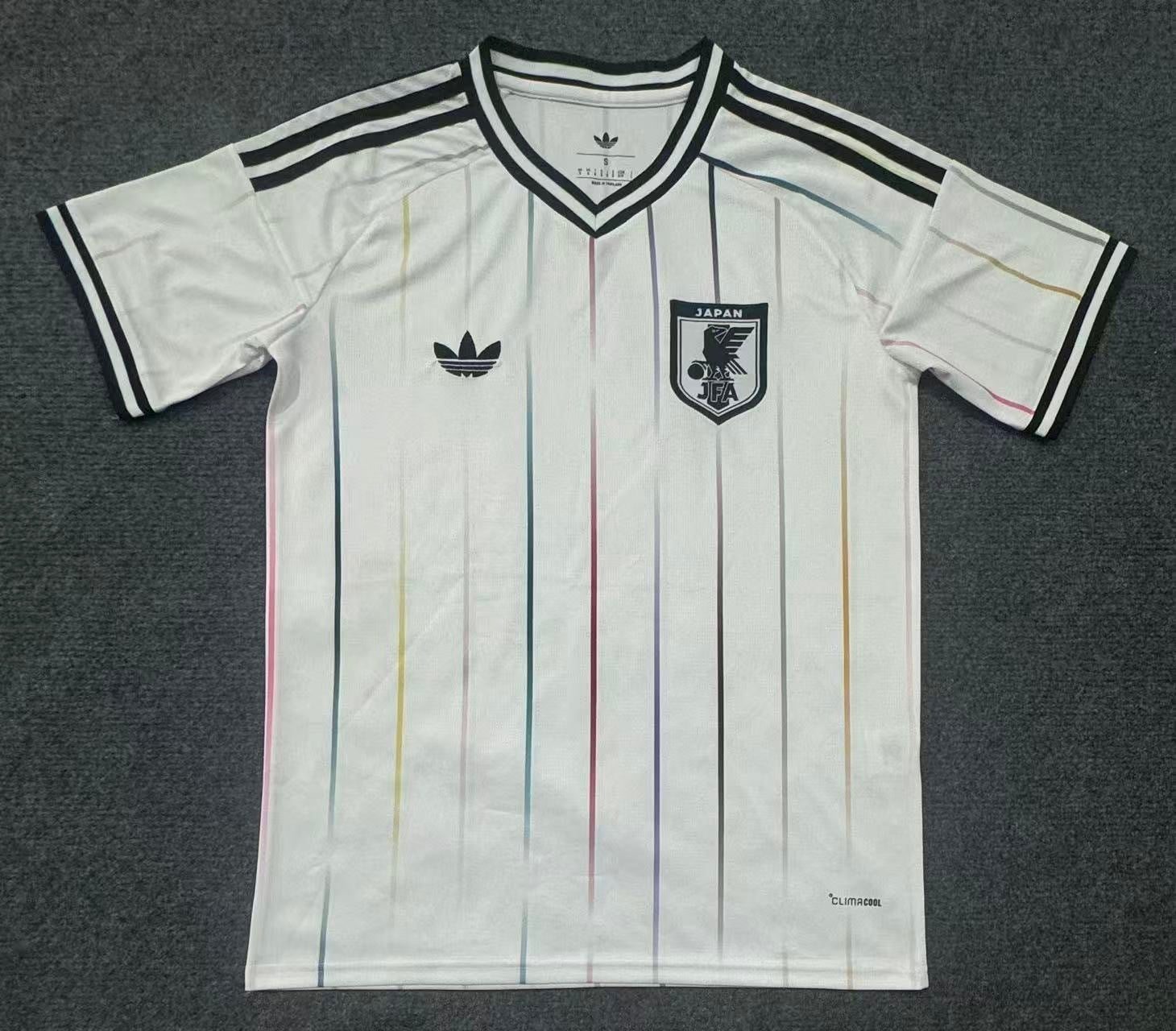 The new Japan jersey for World Cup 26 introduces a fresh, artistic aesthetic to the international stage. Set against a crisp white base, the shirt features delicate vertical pinstripes in a rainbow of pastel shades, offering a modern look for supporters. Finished with a sharp black V-neck and iconic detailing, this jersey is a standout piece for any collection.
